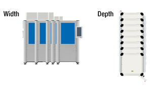 The standardized machine technology offers a range of size options, allowing a choice of widths from 800mm to 2200mm and depths from 1000m to 2200mm. With this flexible modular system, tailor-made special machines can be realized. The process technology for most laser processing methods can be accommodated in an AM 100 cell with a width of 1000 mm and a depth of 1000 mm.